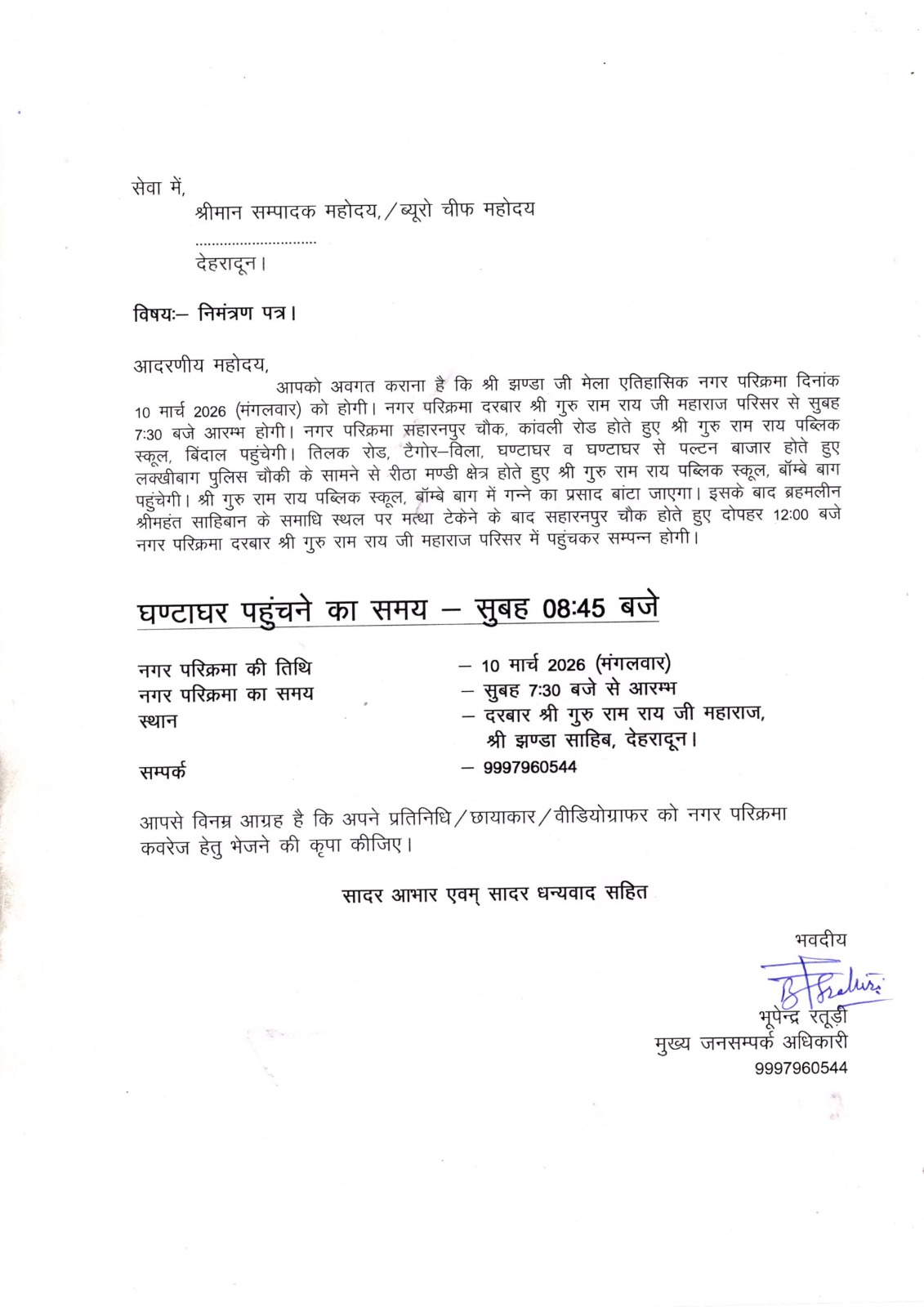 दरबार श्री गुरु राम राय जी महाराज श्री झण्डा महोत्सव-2025 के मेला अधिकारी विजय गुलाटी ने जानकारी दी कि परंपरानुसार श्री झण्डे जी आरोहण के तीसरे दिन नगर परिक्रमा का आयोजन किया जाता है। नगर परिक्रमा में श्रीमहंत देवेन्द्र दास जी महाराज की अगुआई में संगतें दून नगर की परिक्रमा करती हैं। मंगलवार सुबह 7ः30 बजे श्री दरबार साहिब परिसर से नगर परिक्रमा आरंभ होगी। नगर परिक्रमा में 25 हजार से अधिक संगतंे शामिल होंगी। नगर परिक्रमा श्री दरबार साहिब से प्रारम्भ होकर सहारनपुर चैक, कांवली रोड होते हुए श्री गुरु राम राय पब्लिक स्कूल, बिंदाल पहुंचेगी। यहां संगत को चने, मुरमुरे व गुड़ का प्रसाद वितरित किया जाएगा। यहां से तिलक रोड, टैगोर-विला, घण्टाघर व घण्टाघर से पल्टन बाजार होते हुए लक्खीबाग पुलिस चैकी से रीठा मण्डी, श्री गुरु राम राय पब्लिक स्कूल बाॅम्बे बाग पहुंचेगी। श्री गुरु राम राय पब्लिक स्कूल में गन्ने के प्रसाद बांटा जाएगा। इसके बाद ब्रहमलीन श्रीमहंत साहिबान के समाधि स्थल पर मत्था टेकेने के बाद सहारनपुर चैक होते हुए दोपहर 12ः00 बजे नगर परिक्रमा श्री दरबार साहिब वापिस पहुंचकर सम्पन्न होगी।
