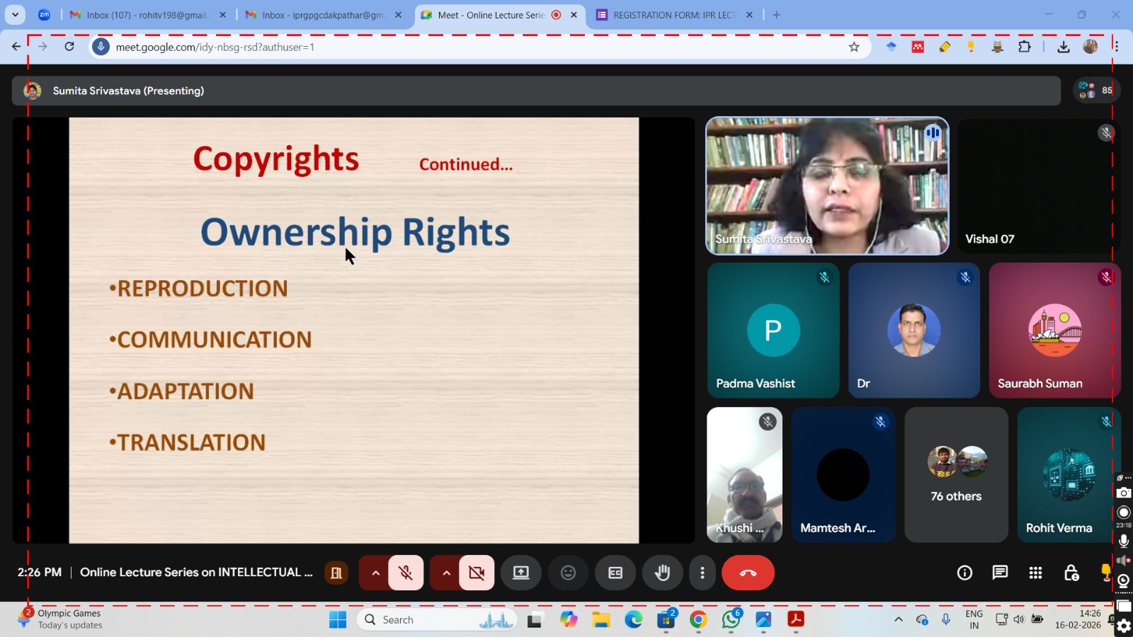 तकनीकी सत्र में आर.एच. गवर्नमेंट पी.जी. कॉलेज, उधम सिंह नगर की प्राचार्य प्रो. (डॉ.) सुमिता श्रीवास्तव ने “बौद्धिक संपदा अधिकारों का परिचय” विषय पर व्याख्यान देते हुए आईपीआर के मूल सिद्धांतों, प्रकारों और शैक्षणिक महत्व को सरल भाषा में समझाया।