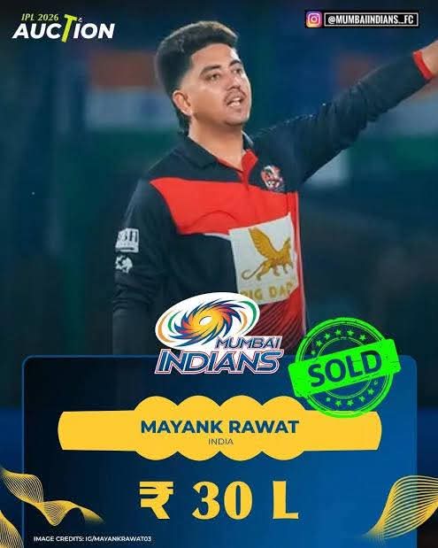 उत्तराखंड के टिहरी गढ़वाल जिले की खास पट्टी, ग्रामसभा गडोलिया तोक (रंगली) के होनहार क्रिकेटर मयंक रावत ने प्रदेश का नाम रोशन कर दिया है। IPL 2026 मिनी ऑक्शन (16 दिसंबर 2025) में IPL की सबसे सफल फ्रेंचाइज़ी मुंबई इंडियंस (MI) ने इस अनकैप्ड ऑलराउंडर को ₹30 लाख (बेस प्राइस) में खरीद लिया। यह मयंक का पहला IPL कॉन्ट्रैक्ट है।