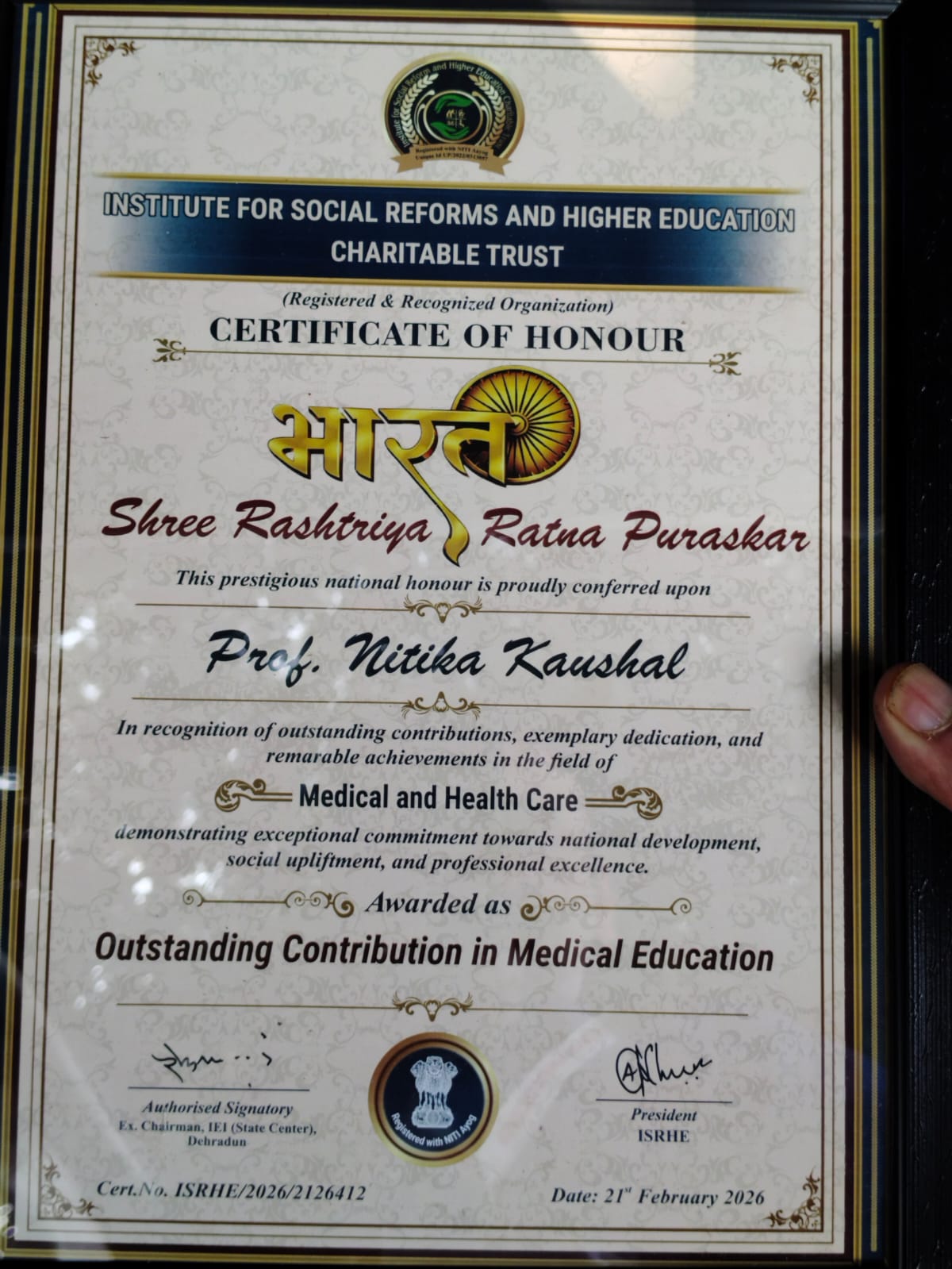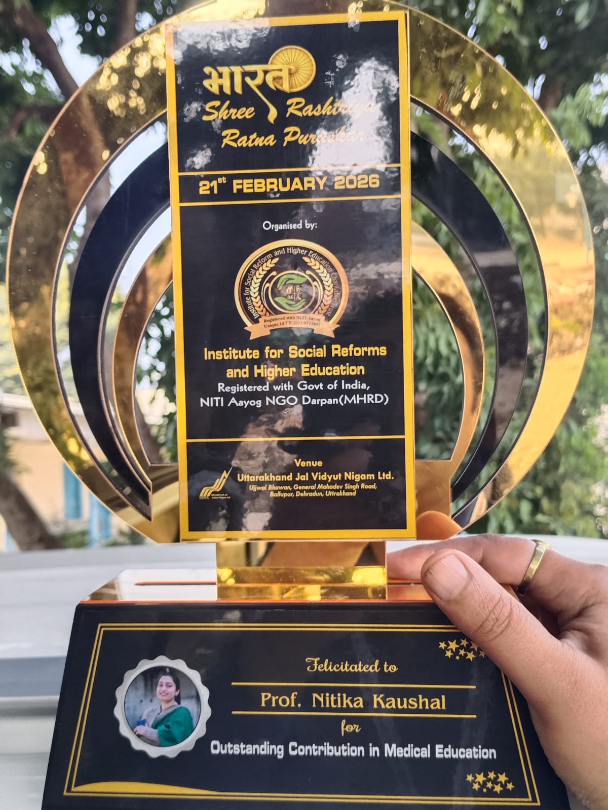 यह सम्मान “Outstanding Contribution in Medical Education” श्रेणी में उनके प्रभावशाली, समर्पित और दूरदर्शी योगदान की राष्ट्रीय स्तर पर स्वीकृति के रूप में प्रदान किया गया।