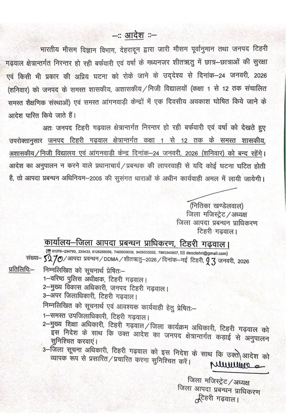 मौसम विभाग के अलर्ट के बाद उत्तरकाशी, टिहरी गढ़वाल, पौड़ी, देहरादून और उधम सिंह नगर के जिलाधिकारियों ने 24 जनवरी को जिले में 12वीं कक्षा तक के सभी सरकारी और निजी स्कूलों के साथ-साथ आंगनबाड़ी केंद्रों में अवकाश घोषित कर दिया है। प्रशासन ने लोगों से सावधानी बरतने और अनावश्यक यात्रा से बचने की अपील की है।